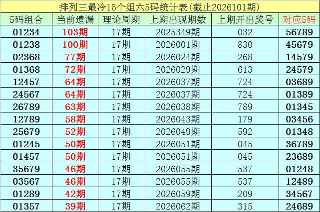 (1)目前排列三5码组六遗漏期数最大的组合为:01234,目前轮空103期;